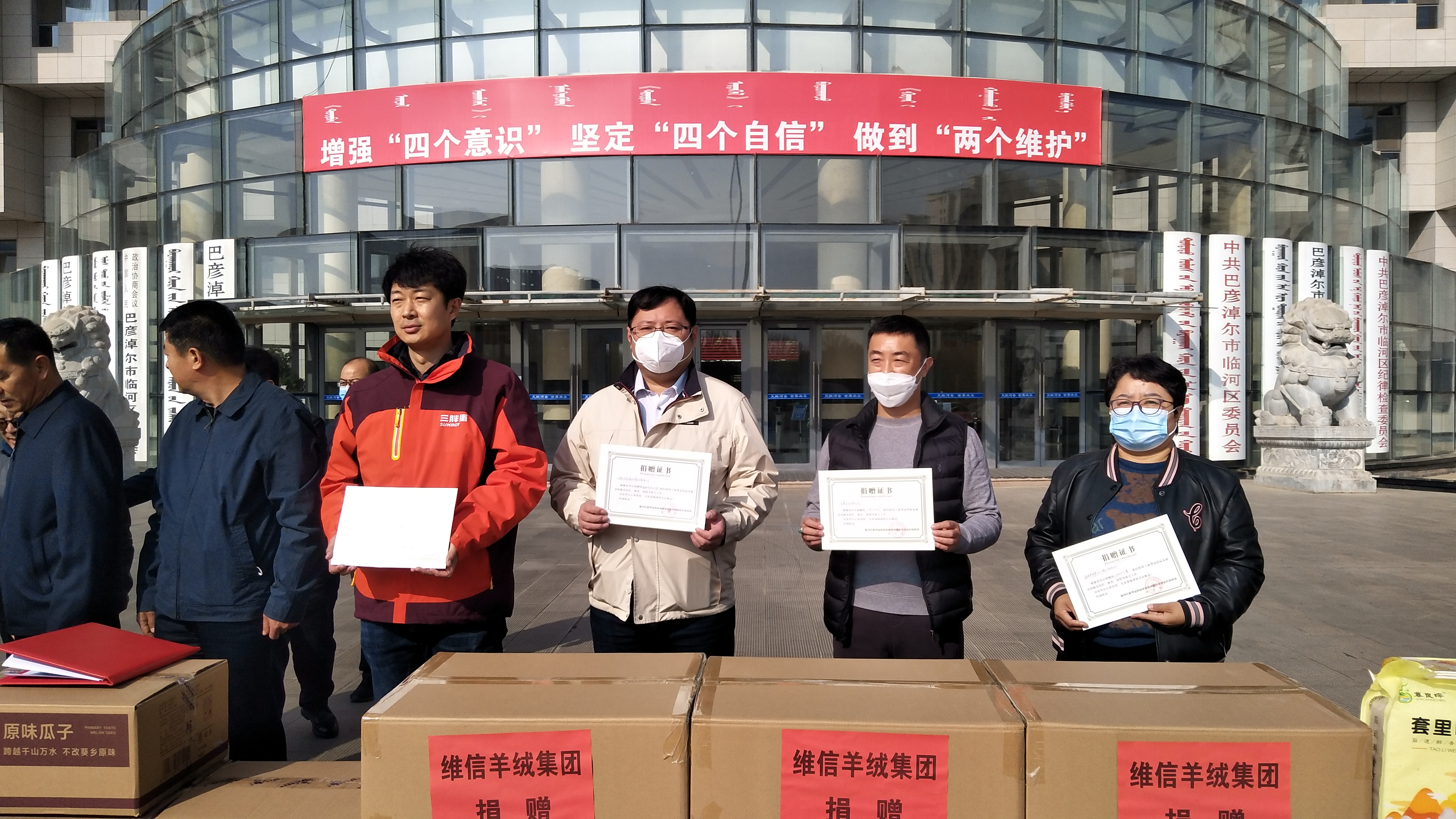 11月5日中午,維信羊絨集團(tuán)等7家會(huì)員單位向巴彥淖爾市臨河區(qū)抗疫捐贈(zèng)物資,捐贈(zèng)儀式在臨河區(qū)政府辦公樓前舉行,區(qū)委副書記、政法委書記陳海維參加活動(dòng)并講話,對(duì)愛(ài)心企業(yè)的高尚情操給與了高度評(píng)價(jià),區(qū)政協(xié)副主席劉浩主持了捐贈(zèng)儀式。