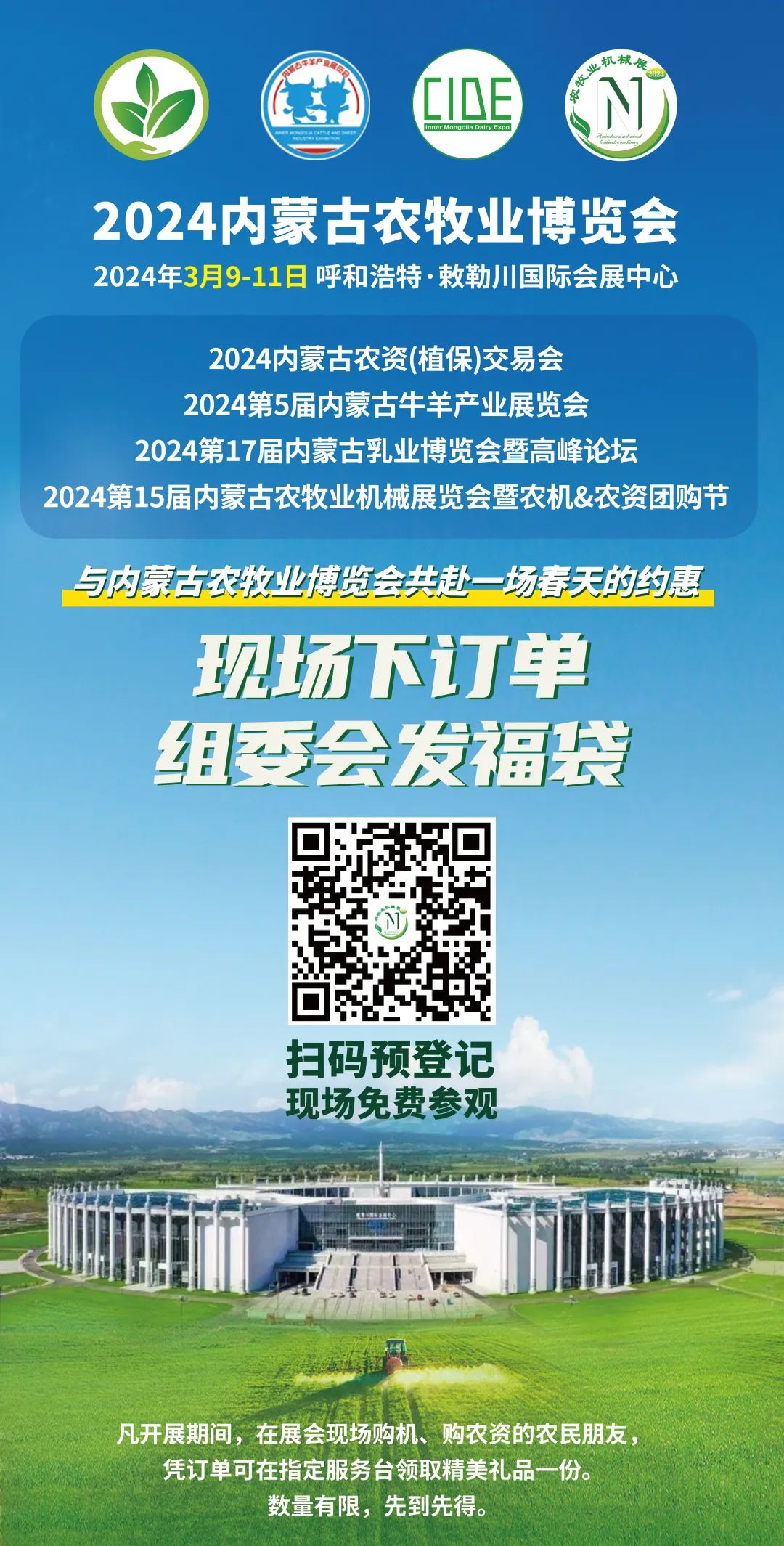 歡迎參會(huì)!更多展會(huì)資訊、請(qǐng)關(guān)注微信公眾號(hào):內(nèi)蒙古農(nóng)機(jī)展。進(jìn)入展會(huì)須注冊(cè)登記方可入場(chǎng),煩請(qǐng)?jiān)诠娞?hào)菜單欄"參觀指南"-“參觀展會(huì)”按鈕點(diǎn)擊,隨后填寫(xiě)信息進(jìn)行注冊(cè),憑注冊(cè)成功的二維碼即可入場(chǎng)參觀。或掃描以下二維碼,進(jìn)行預(yù)登記。