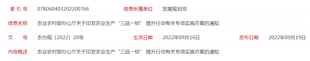 標題:農業(yè)農村部辦公廳關于印發(fā)農業(yè)生產“三品一標” 提升行動有關專項實施方案的通知